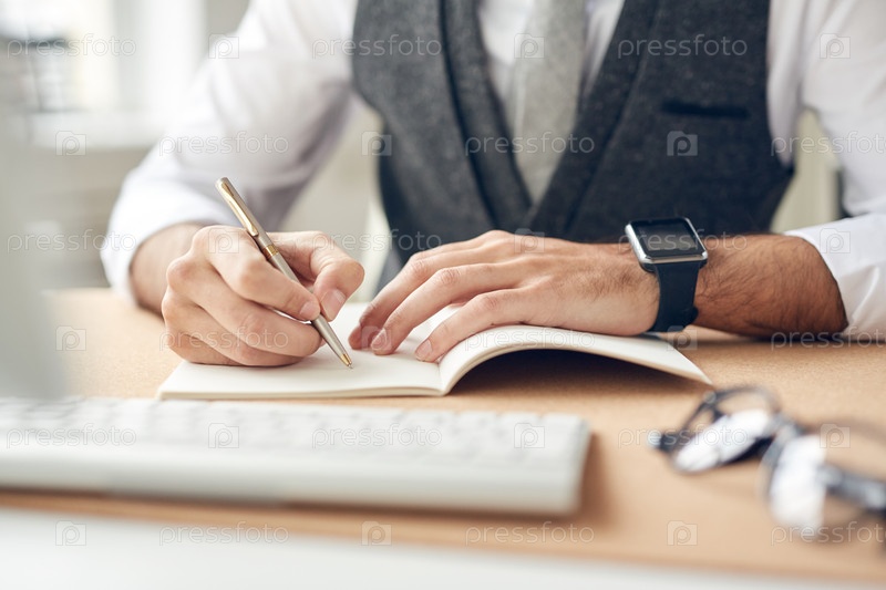 Близкий план неузнаваемого бизнесмена со смарт-часом, сидящего за столом и делающего записки в эскизном блокноте во время планирования деловых задач