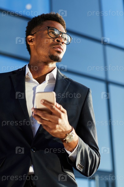 Ниже вид на серьезного целеустремленного молодого афроамериканского бизнесмена с бородой, стоящего против стеклянного здания и пользующегося телефоном