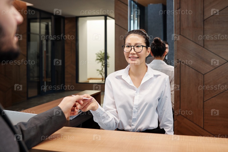 Молодая азиатская женщина-ресепшнёр пропускная карточка от гостиничного номера к бизнесмену