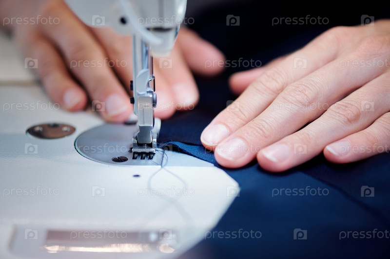 Руки профессиональной швеи, держащей кусок ткани рядом с иглой