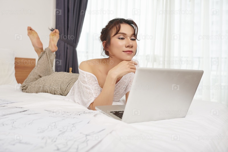 Женщина, использующая ноутбук в спальне