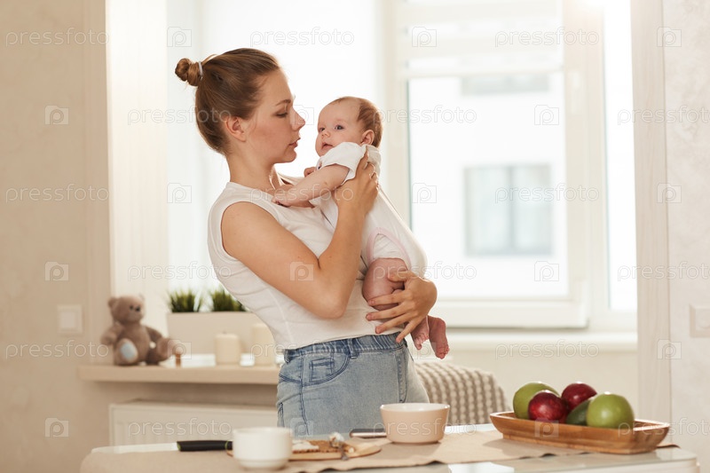 Молодая мать в белом футболке разговаривает со своим ребенком, стоя на кухне рядом с столом с едой
