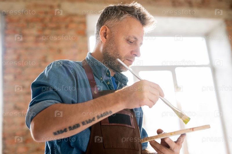 Серьезный зрелый художник в рабочей одежде, смешивающий цвета с кистью на палитре