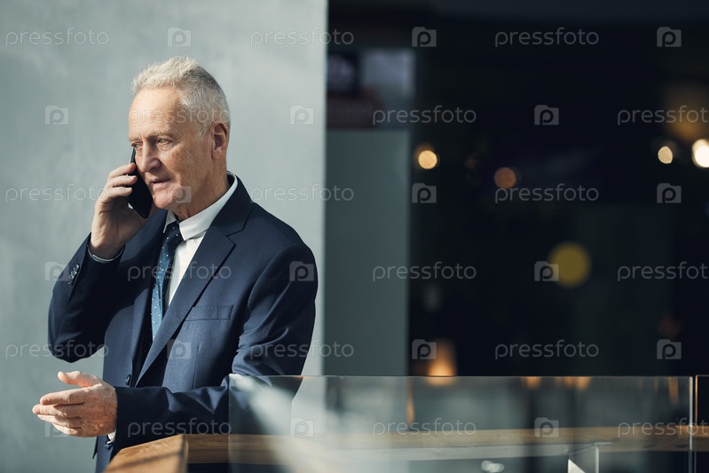 Обеспокоенный старший бизнес-менеджер в костюме, опирающийся на перила в холле и решающий важные вопросы во время разговора по телефону