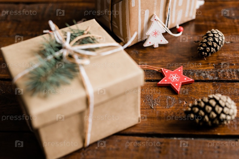Рождественские украшения, сосновые шишки и упакованная подарочная коробка с хвойными деревьями наверху