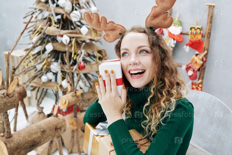 Взволнованная девушка держит рождественский подарок