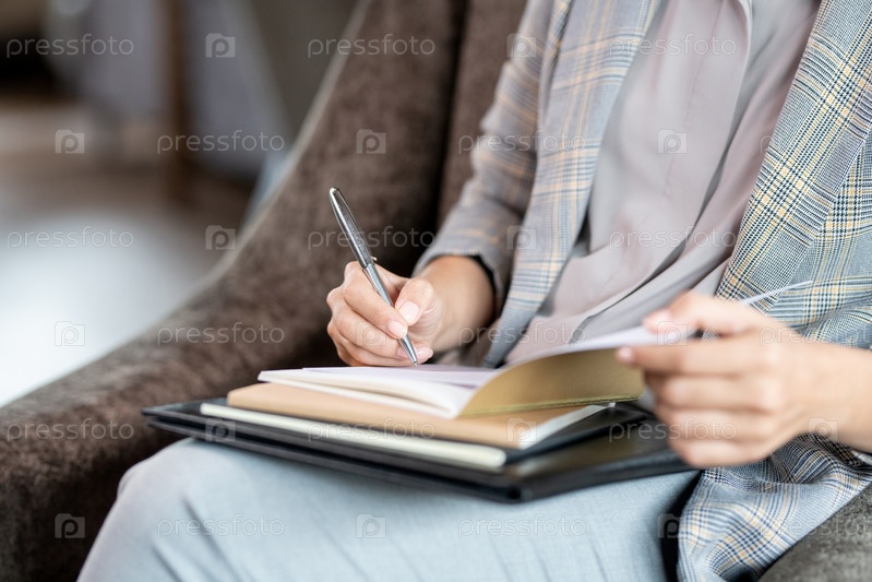 Руки молодой элегантной деловой женщины с ручкой на странице копийника