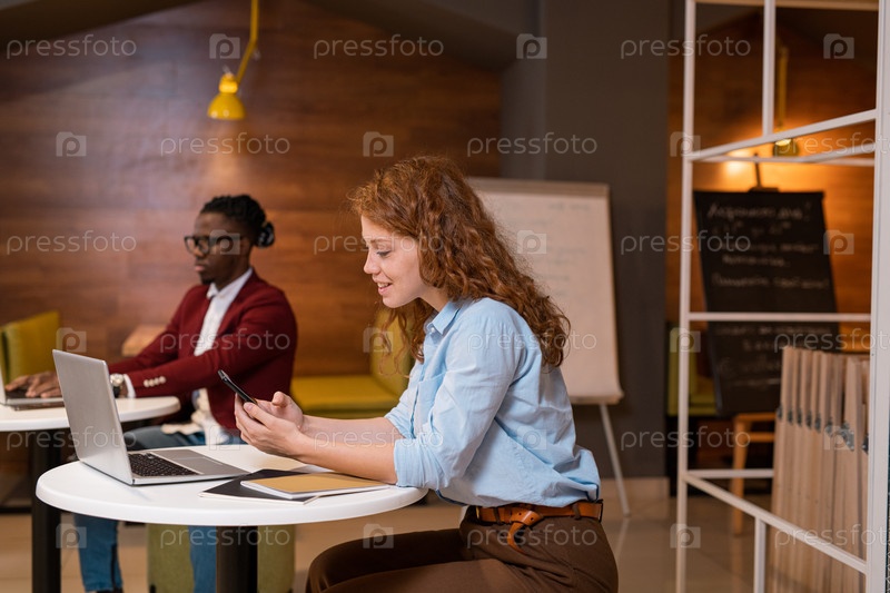 Красивая молодая случайная женщина с длинными волнистыми волосами, прокручивающая смартфон в кафе