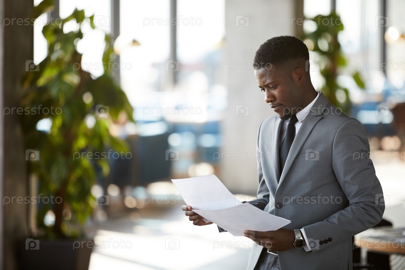 Серьезный молодой афроамериканский бизнесмен в стильном костюме сосредоточился на бумажных данных, изучая контракт в холле