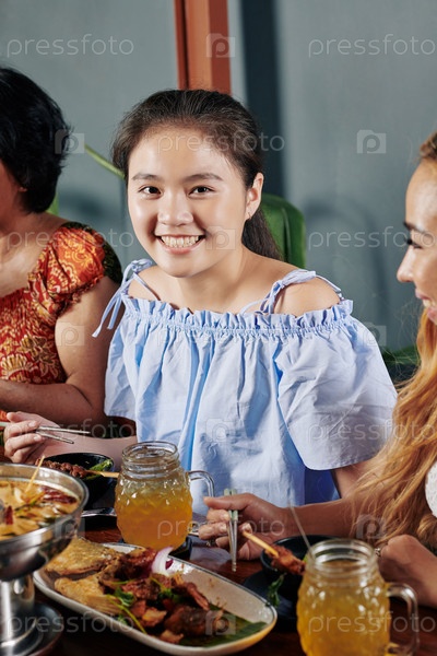 Счастливая азиатская девушка ест ужин