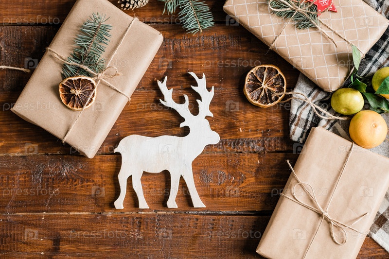 Рождественский фон с игрушечными оленями, упакованными коробками для подарков, клементинами и украшением