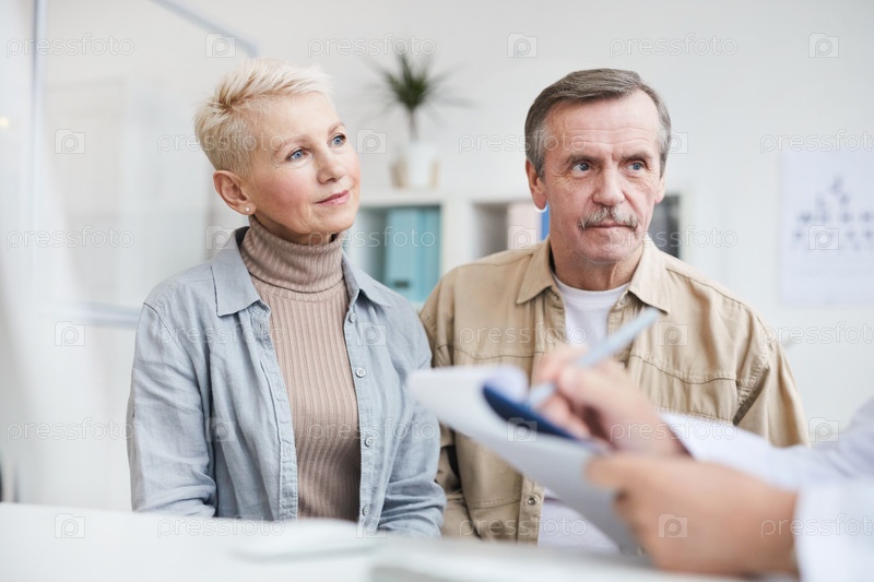 Содержание старшей пары в повседневных нарядах, сидящей в кабинете врача и слушающей лечащего врача во время консультации