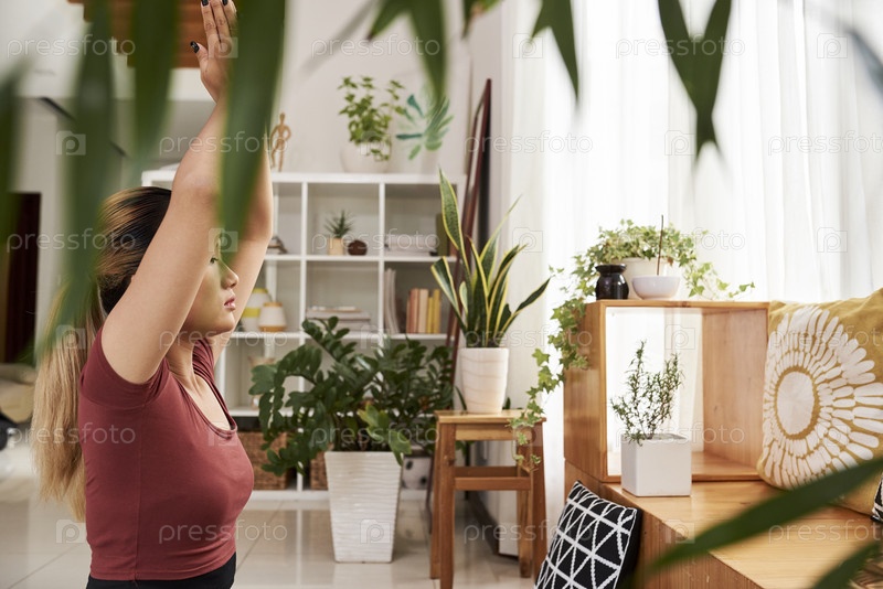 Молодая азиатская женщина занимается спортом дома