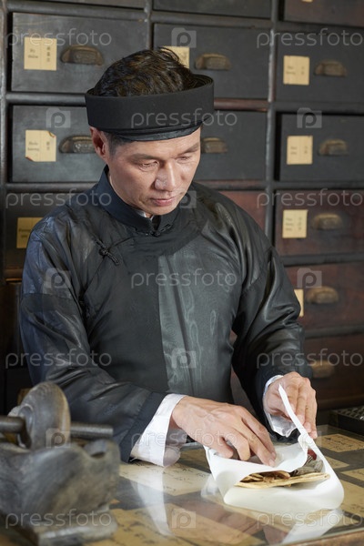 Работник аптеки упаковывает сухие грибы шиитаке