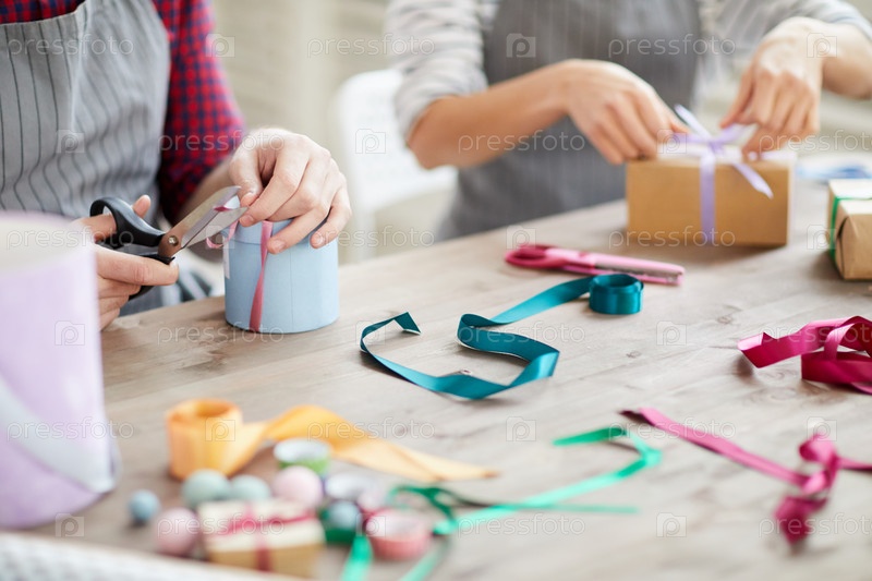 Близкий план неузнаваемых квалифицированных ремесленников, сидящих за столом с красочными лентами и связывающих их на коробках