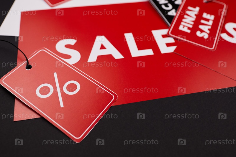 Ближайшее изображение красных этикеток и тегов, посвященных продаже, новая акция в концепции магазина