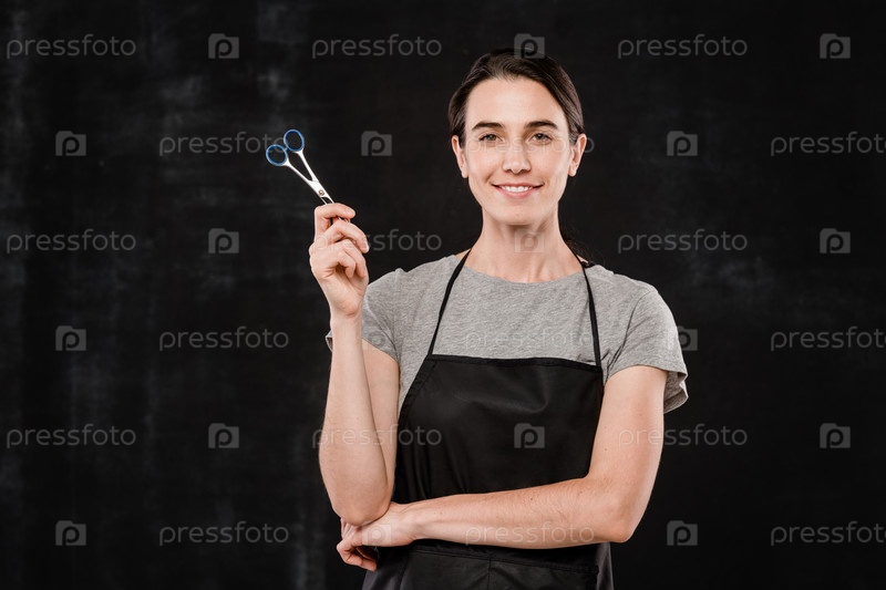 Профессиональная парикмахерша в фартуке держит ножницы, глядя на тебя