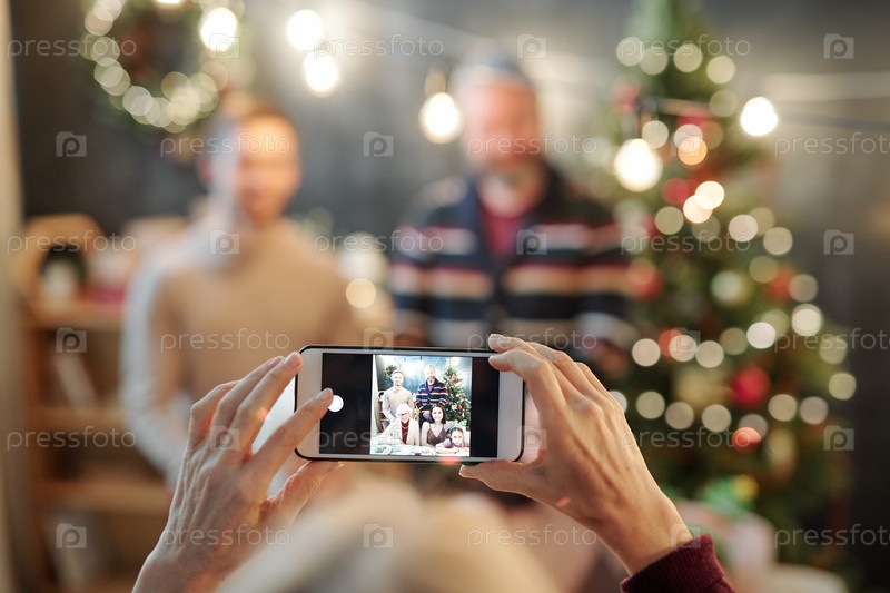 Руки женщины, держащей смартфон с фотографией счастливой любящей семьи