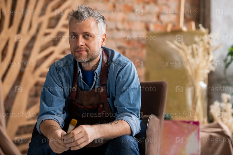 Успешный творческий художник с кистью сидит в кресле в современной студии