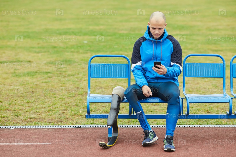 Серьезный молодой лысый паралимпийский спортсмен в спортивной куртке, сидящий на скамейке и использующий смартфон во время отдыха на стадионе