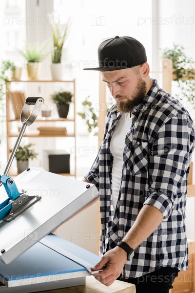 Серьезный ремесленник держит полосу с декором, печатая ее на новом ошейнике