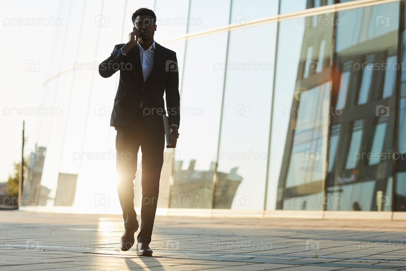 Уверенный в себе молодой афроамериканский бизнесмен в формальном костюме, идущий по деловому району и разговаривающий на сотовом телефоне, он работает в движении