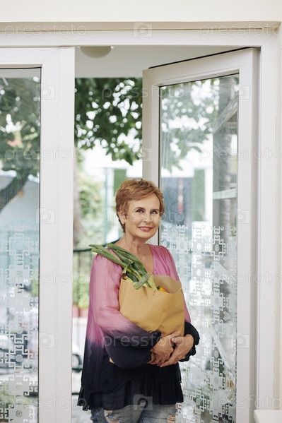 Пожилая женщина входит в дом
