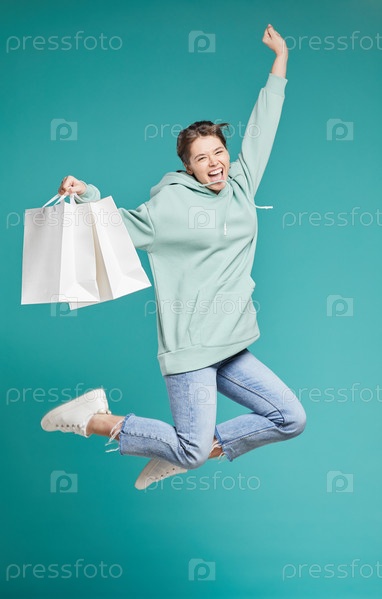 Портрет положительно возбужденной хипстерской девушки в капюшоне, прыгающей с покупками после распродажи покупок, зеленый фон
