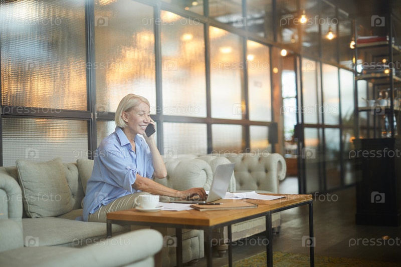Позитивная уверенная зрелая леди с светлыми волосами сидит на удобном диване в лофт-ресторане и использует ноутбук, разговаривая по мобильному телефону