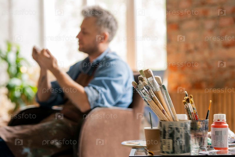 Две пары кистей в грязных оловянных баночках и банка гуаши на столе