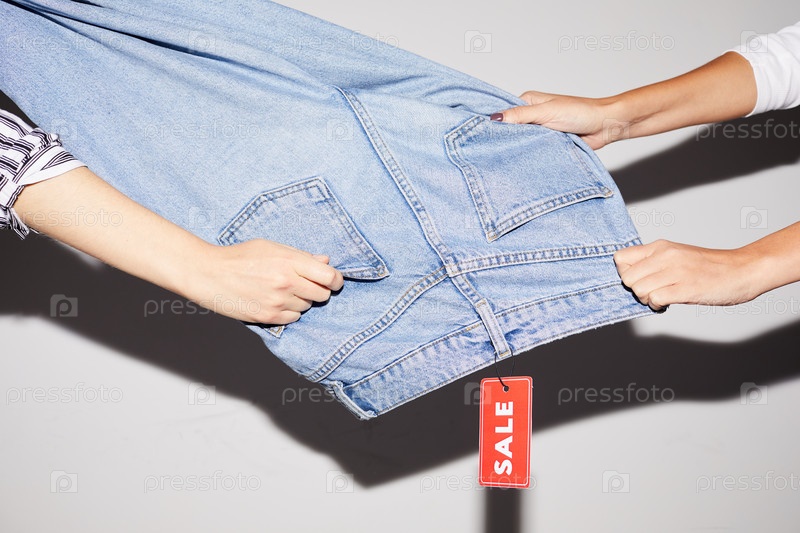 Близкий план неузнаваемых женщин, тянущих джинсы в разных направлениях во время покупки одежды на распродаже