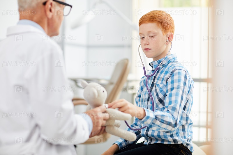 Мальчик, использующий стетоскоп в кабинете врача
