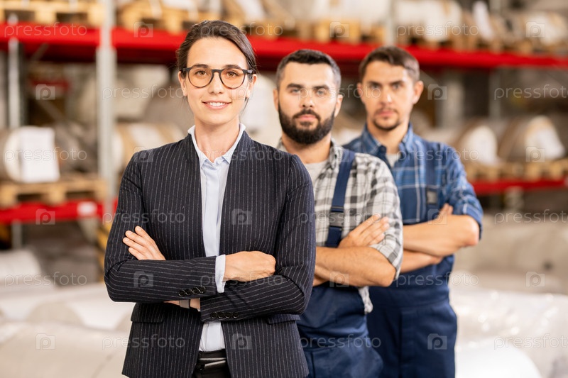 Три уверенных в себе рабочих с перекрещенными руками большой современной фабрики химической обработки