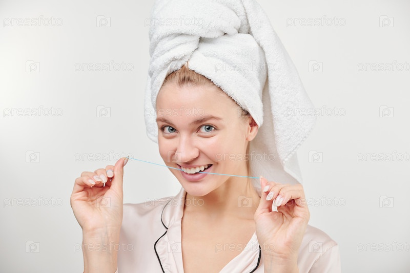Веселая здоровая молодая женщина с полотенцем на голове собирается использовать зубную нитку
