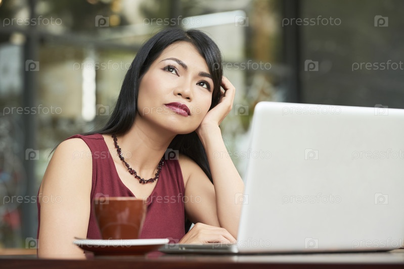 Вдумчивая женщина, сидящая за ноутбуком