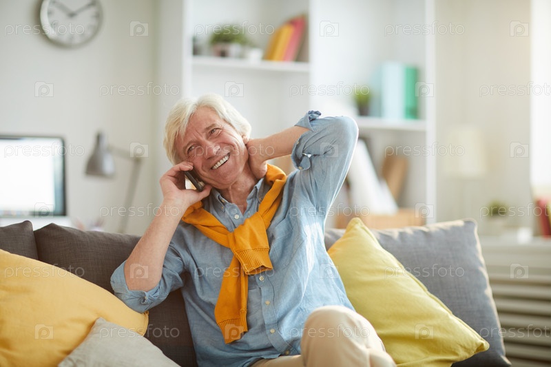 Улыбающийся старший мужчина разговаривает по телефону дома