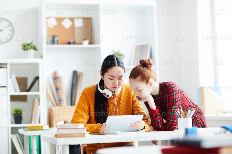 Серьезные мыслящие студенты в непринужденной одежде смотрят видео на планшете, отдыхая во время перерыва