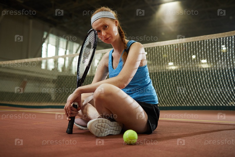 Портрет серьезной рыжеволосой молодой женщины с косыми волосами, сидящей со скрещенными ногами на теннисном корте и опирающейся на ракетку