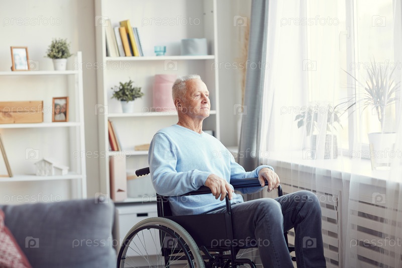 Удовлетворённый мыслящий старший мужчина в обычном свитере и джинсах сидит на инвалидной коляске и смотрит в окно, проводя время дома