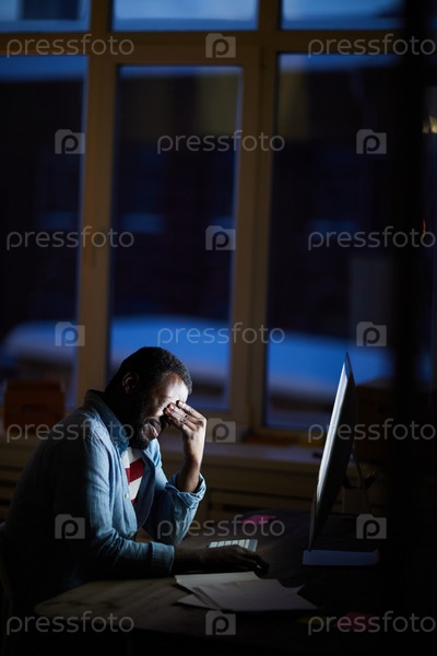 Расстроенный усталый молодой чернокожий дизайнер в непринужденной рубашке сидит за столом перед компьютером и моет глаза, работая по ночам