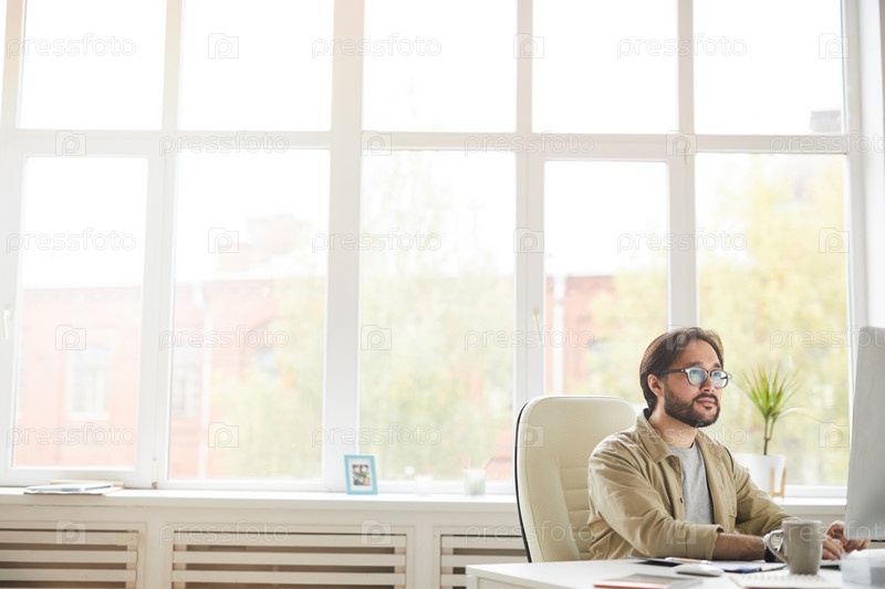 Серьезный хипстер молодой азиатский бородатый разработчик приложений в очках, сидящий за столом и использующий компьютер во время тестирования нового приложения