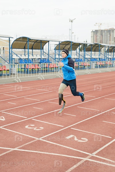 Мотивированный молодой паралимпийский спортсмен в спортивной куртке бежит на пустом стадионе, готовясь к важному соревнованию