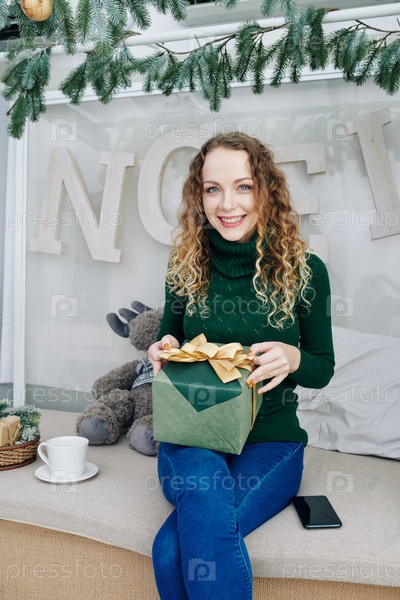 Красивая женщина открывает подарок на Новый год