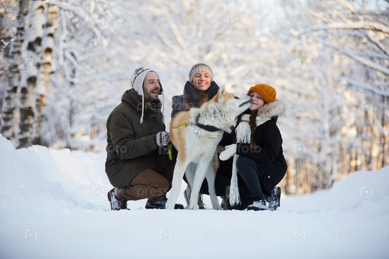 Счастливая семья с собакой на открытом воздухе