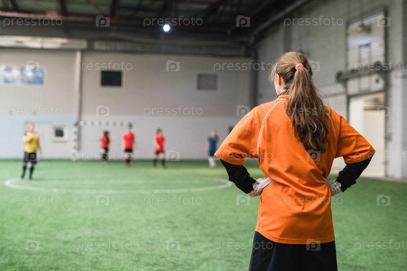 Обратный взгляд на молодую женщину-голкипера в спортивной форме, стоящую на поле