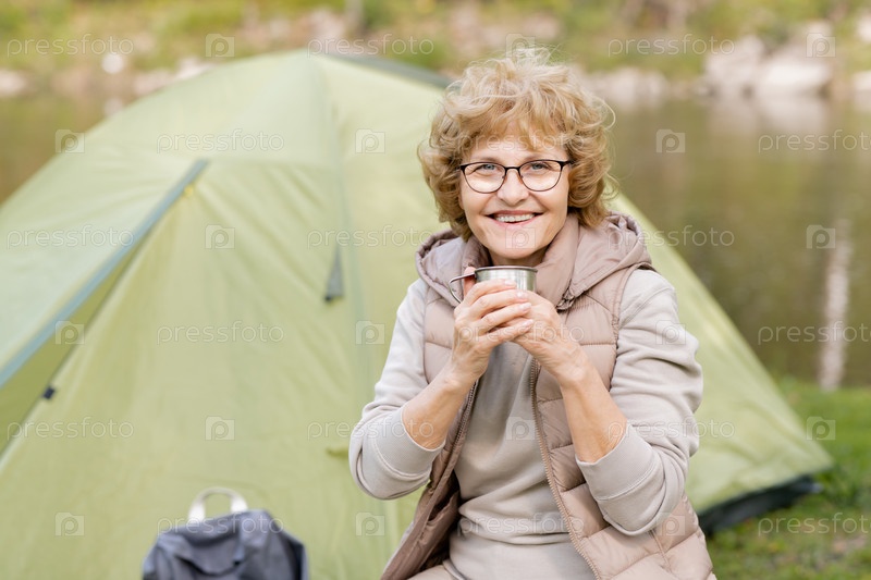 Счастливая зрелая женщина с горячим напитком смотрит на тебя, наслаждаясь отдыхом у палатки