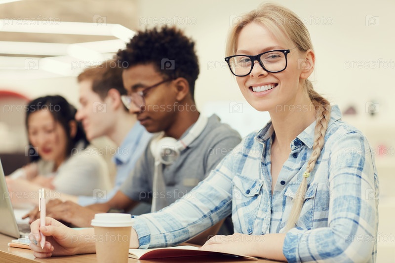 Портрет веселой взволнованной студентки с блондинкой и очками, сидящей за столом со своими одноклассниками и записывающейся в учебник на лекции