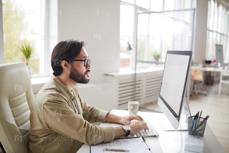 Концентрированный хипстер азиатский арт-директор с бородой сидит за столом и печатает на клавиатуре компьютера, изучая дизайн проекта