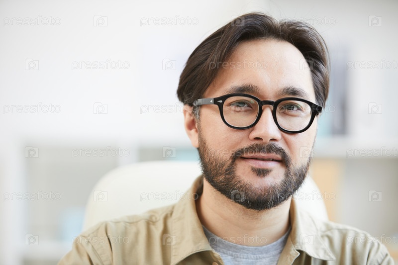 Близкий снимок содержимого Интеллигентный молодой азиатский мужчина с бородой, носящий очки и работающий в офисе