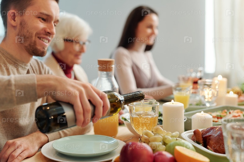 Молодой человек наливает вино в бокал, сидя за обслуживаемым столом